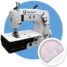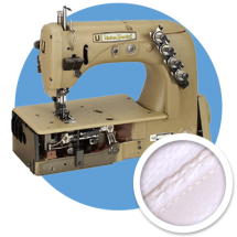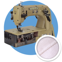 Heavy duty two needle double locked stitch sewing machine with top and bottom feed. Universally applicable for all seams on container bags, inserting top covers and attaching filling and discharging tubes on container bags.